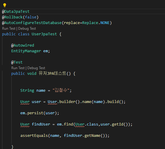 @SpringBootTest @AutoConfigureTestDatabase(replace=Replace.NONE) public class UserRepositoryTest { @PersistenceContext EntityManager em; @Autowired UserRepository userRepository; @Test public void 유저생성테스트() { String name = "김철수"; userRepository.save(name); User user = em.find(User.class, 1L); assertEquals(name, user.getName()); } -