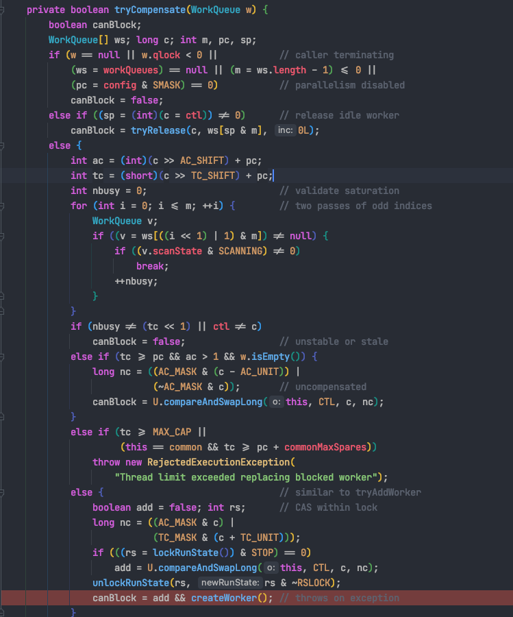 - 맨아래에 ForkJoinPool의 managedBlock을 호출하는게 보인다. 뭔가 느낌이 좋다.!! 들어가보자