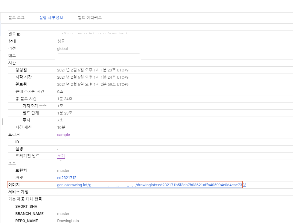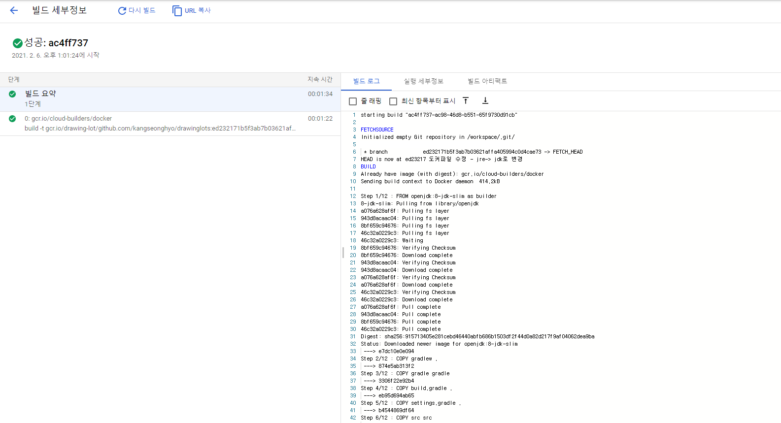 - 빌드를 클릭해서 세부정보를 보면 빌드로그를 확인할 수 있다.