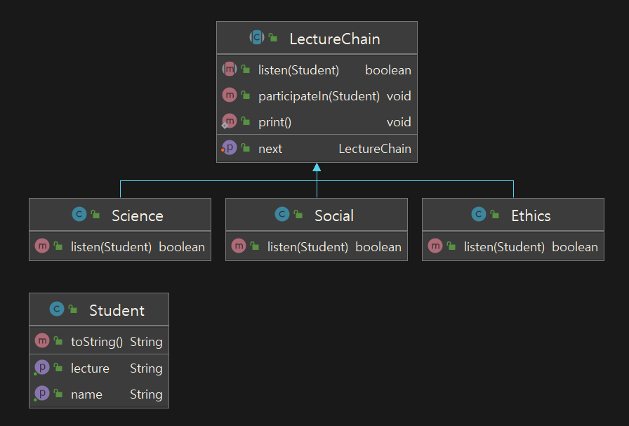 - Client와 ConcreteHandler를 유연하게 연결하는것이 포인트이다. 뒷일이 사슬처럼 연결되어 처리된다.
