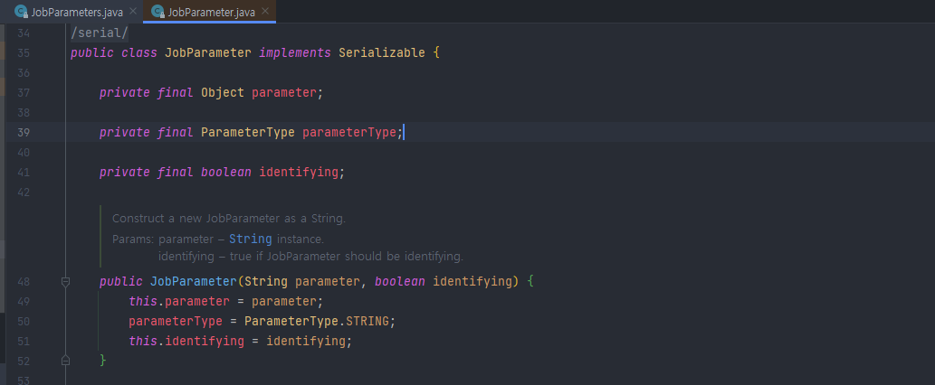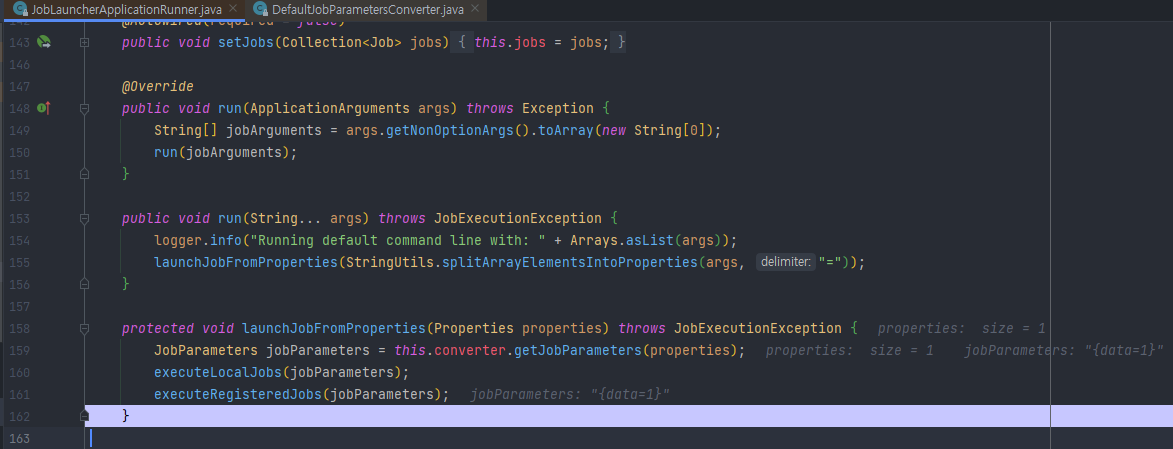 - JobParameters는 Map<String, JobParameter> 형태로 argument 값을 저장한다.