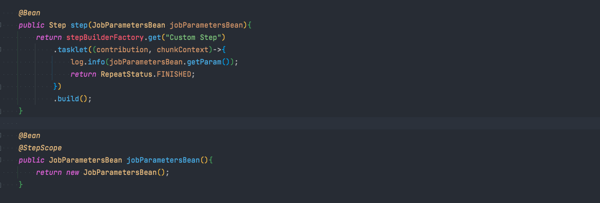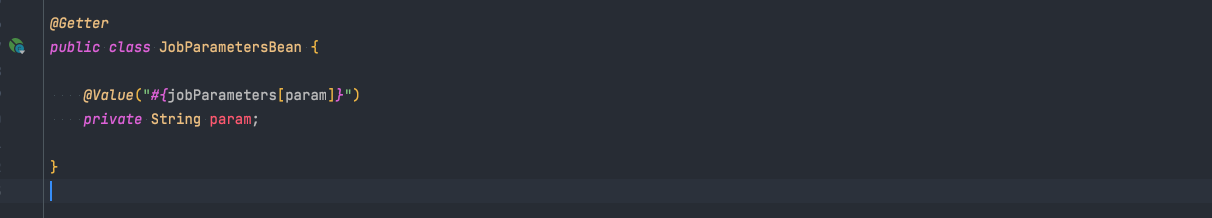 - 아예 JobParameters를 가져오는 Bean 클래스를 만들어 주는 방법도 있다.