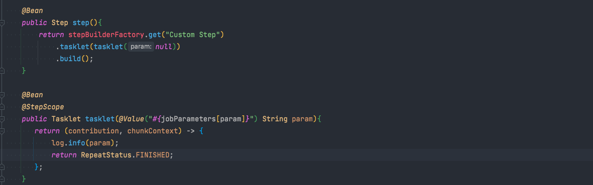 - @Value를 이용하여 Bean 생성시에 주입해주는 방법이 있다. #{jobParameters[이름]} 형태로 사용가능