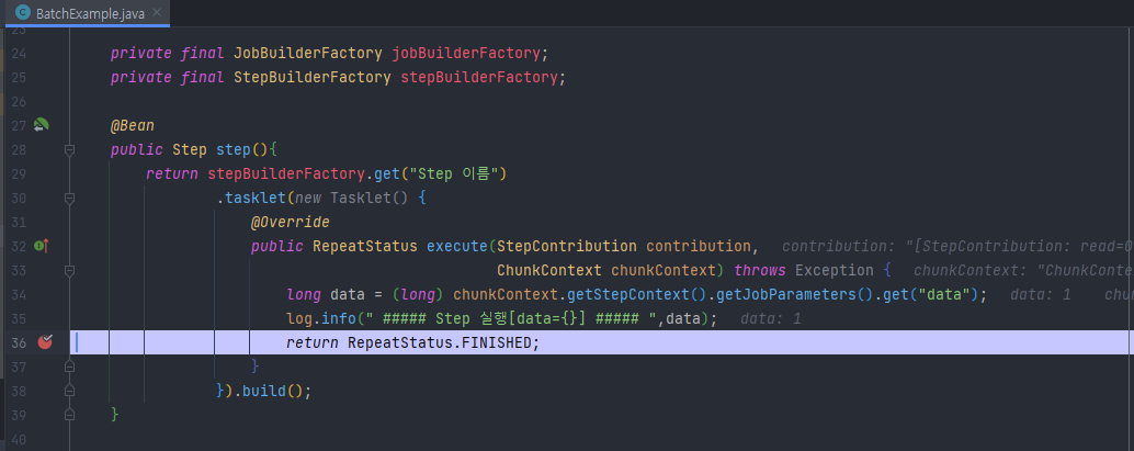 - 예제의 tasklet 구현부를 보면 excute 메서드에 StepContribution과 ChunkContext를 볼 수 있다.