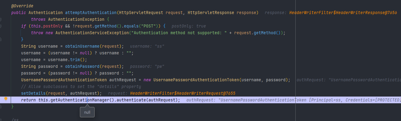 - 인증처리가 어떻게 이루어지는지 이 UsernamePasswordAuthenticationFilter 를 먼저 살펴보고 분석 & 테스트 해보았다.