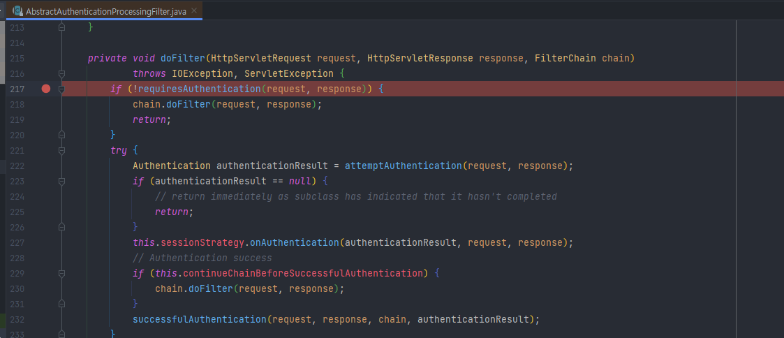 - 그래서 UsernamePasswordAuthenticationFilter 의 super인 AbstractAuthenticationProcessingFilter의 .requiresAuthentication 메서드를 보면