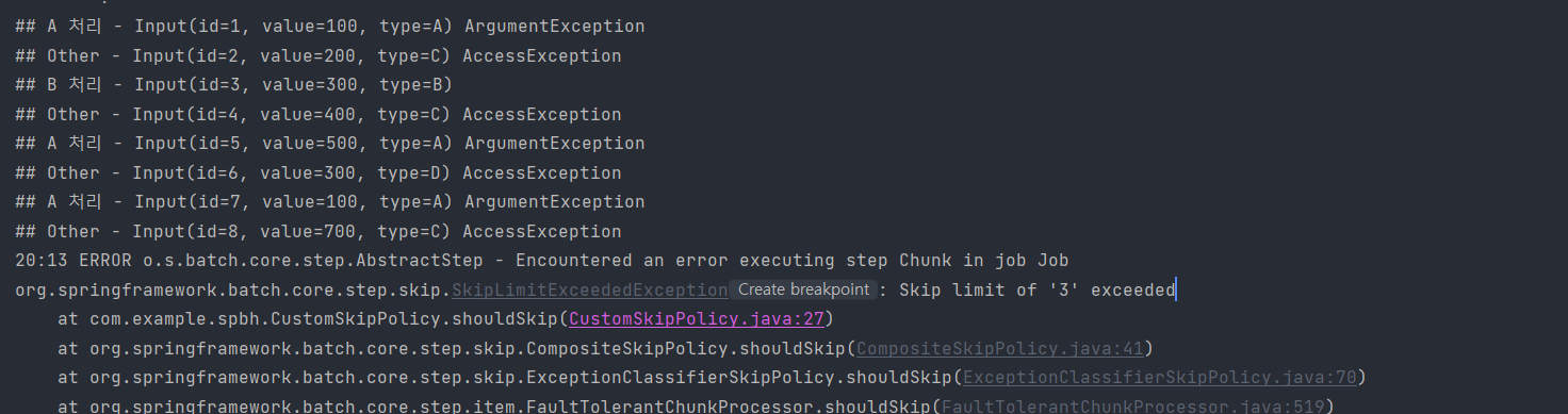 - 위와 다르게 각각의 Exception에 대해 skip 처리해야하는 경우도 있다. 그 전에 SkipPolicy를 살펴보자