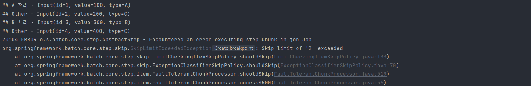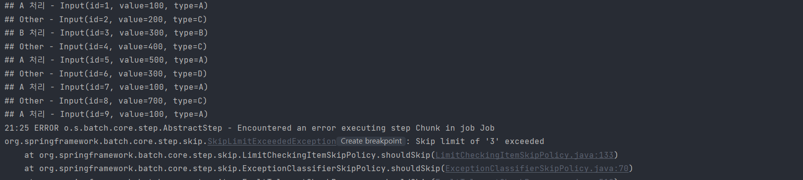 - 테스트 해보면 설정한대로 limit가 발생한 것을 볼 수 있다. 이런식으로 SkipPolicy 같은 경우 custom하게 처리가 가능하다.
