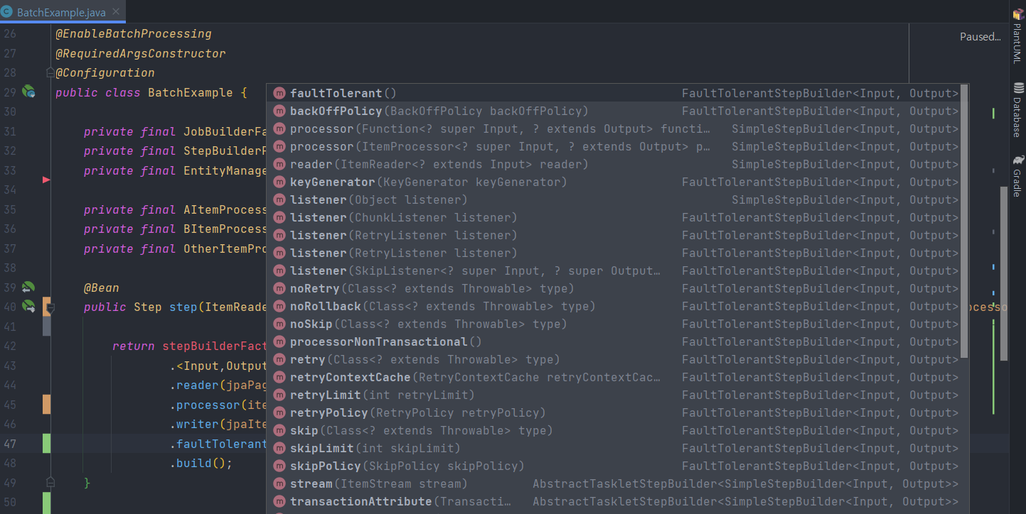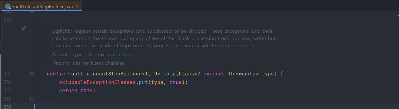 - Step을 만들때 .faultTolerant 메서드를 볼 수가 있다. 이름처럼 Step에 대한 falut를 허용한다라는 의미를 지니고 있다.