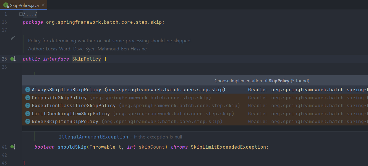 - SkipPolicy는 인터페이스명 그대로 어떤식으로 skip 처리 할지를 정책을 정하는 부분이다. 이미지에 보이는 것처럼 5개의 구현체들이 있다.