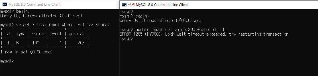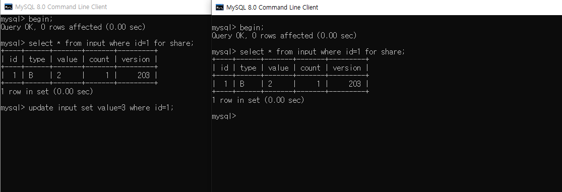 - 아래 보는 것 처럼 Shared Lock이 걸린 트랜잭션이 commit 될때까지 오른쪽 update는 대기상태가 된다.
