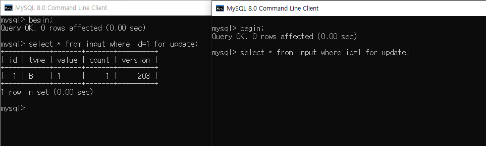 - Lock을 테스트하기 위해서는 서로 다른 connection이 필요하기 때문에 두개를 띄워서 테스트 해야한다.