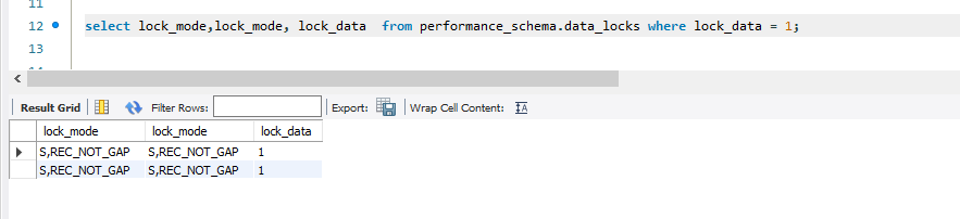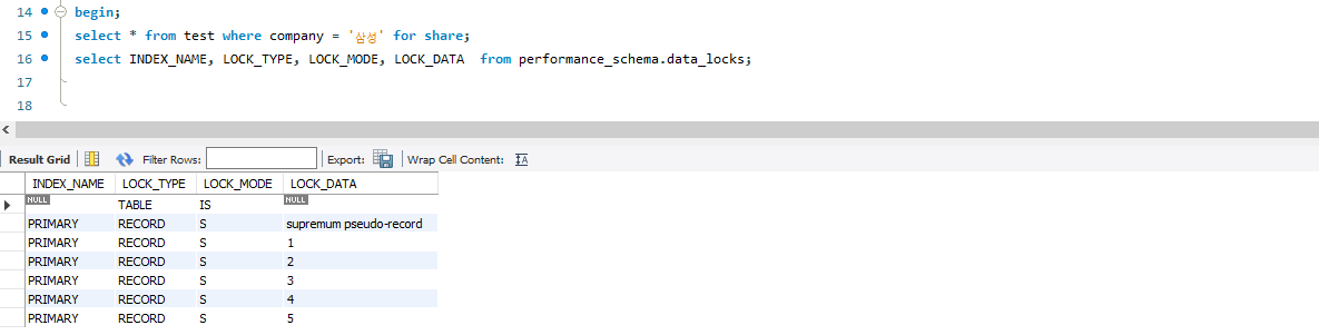 - data의 lock 여부는 아래 쿼리를 통해 확인 할 수 있고 lock_mode의 S 표시가 Shared Lock 이라는 의미이다.