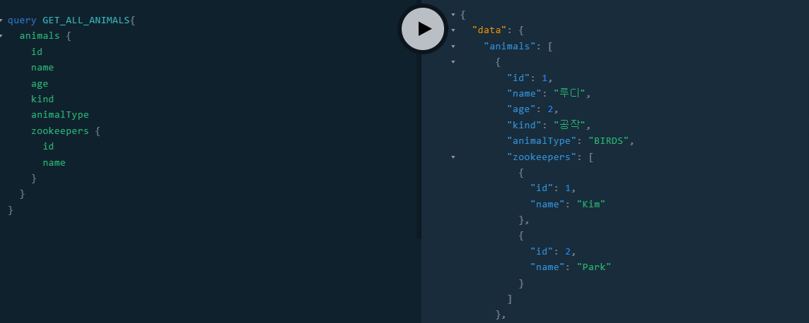 - 이 zookeepers 부분은 animal 메서드가 아닌 따로 클래스를 만들어서 GraphQLResolver를 이용해서 만들었다.