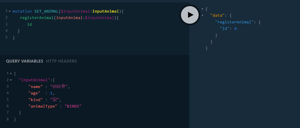 - registerAnimal 의 return 값은 Animal 으로 했다. 이부분은 고민을 해봤는데 DTO를 쓰는 이유가 레이어 분리 목적이 있지만 내가 원치않는 필드 값이 Client로 전달 되는것을 막기 위해서라고 개인적으로 보고 있는데 graphql은 이를 스키마에서 관리할 수 있으니 굳이 번거롭게 쓸 필요가 없을것 같다.