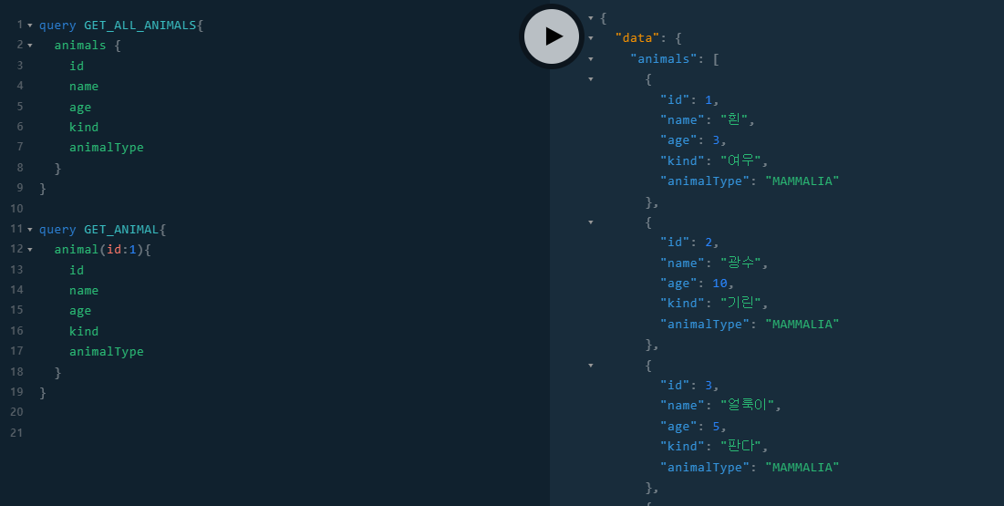 => 로직을 보면 응답값이 AnimalDTO가 아니다. 즉 이부분은 return값에 대한 조립을 graphql이 직접한다는 것을 알수 있다.