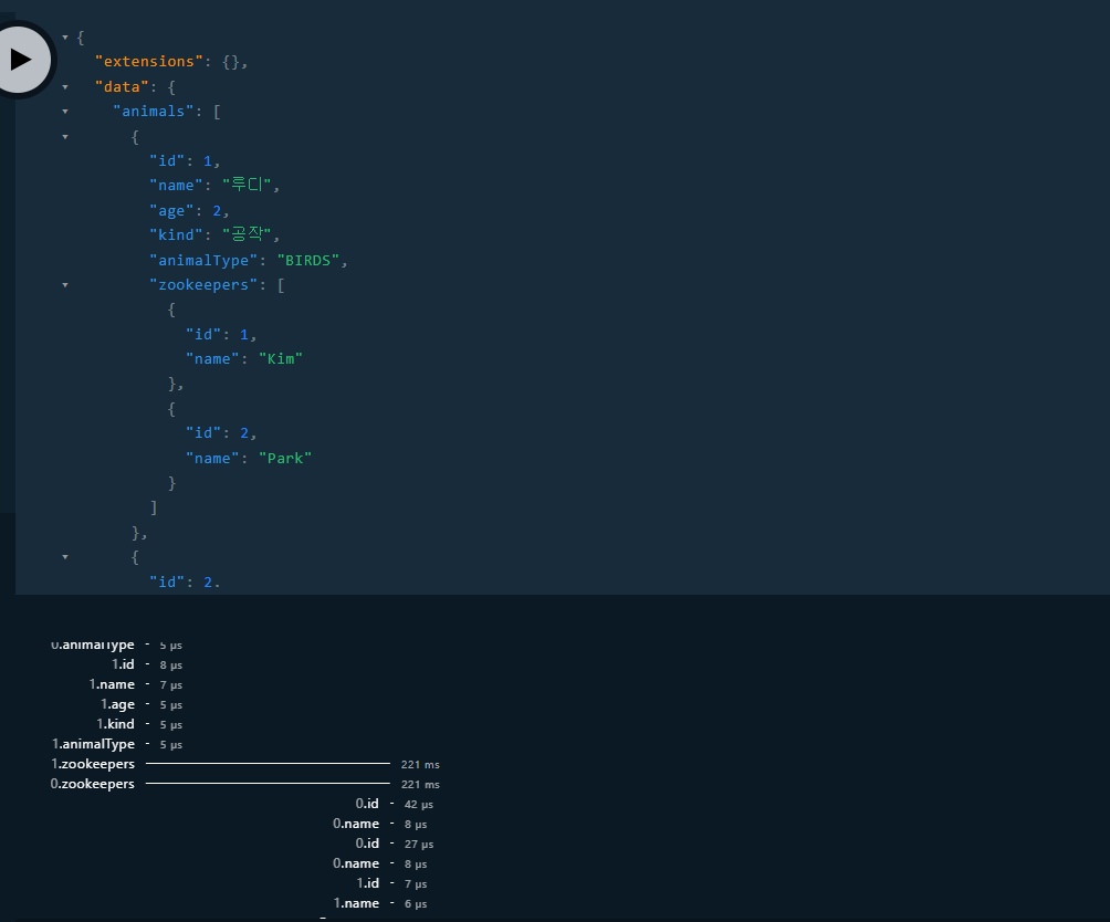 - 지난 포스팅에서 .animals 을 불러올때 .zookeeper를 추가했고 GraphQLResolver로 분리를 해보았다. 만약 이부분이 오래걸리면 어떻게 될까 알아보자