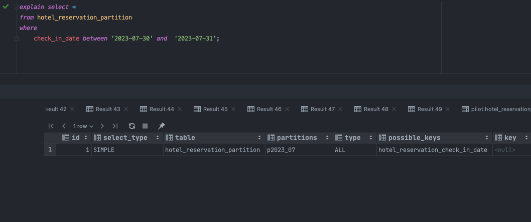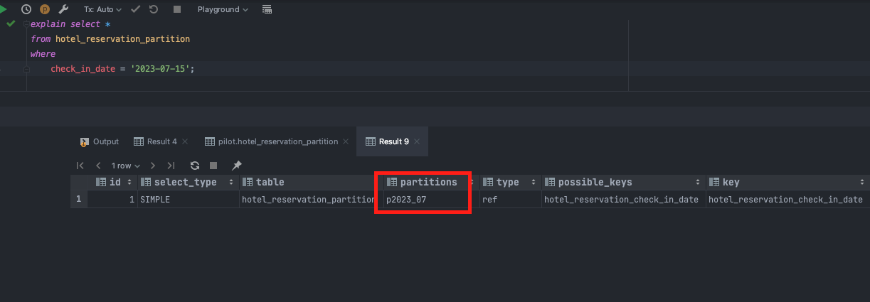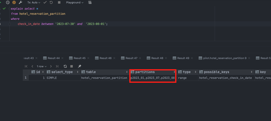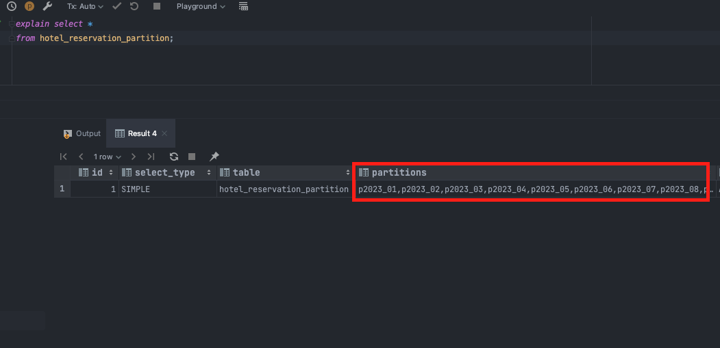 - 다 만들었으면 실행계획을 한번 조회해보면 달라진 부분이 보이는데 partitions 부분에 아까 만든 파티션들이 보인다.