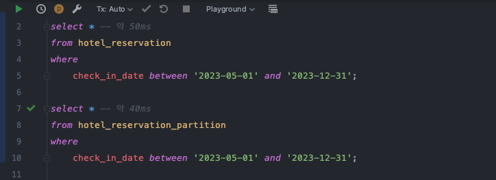 - 데이터가 적으면 관리요소가 늘어나는 파티션 테이블을 굳이 사용할 필요가 없지만 데이터가 많아질수록 조회 성능이 좋지 않을 것이다.