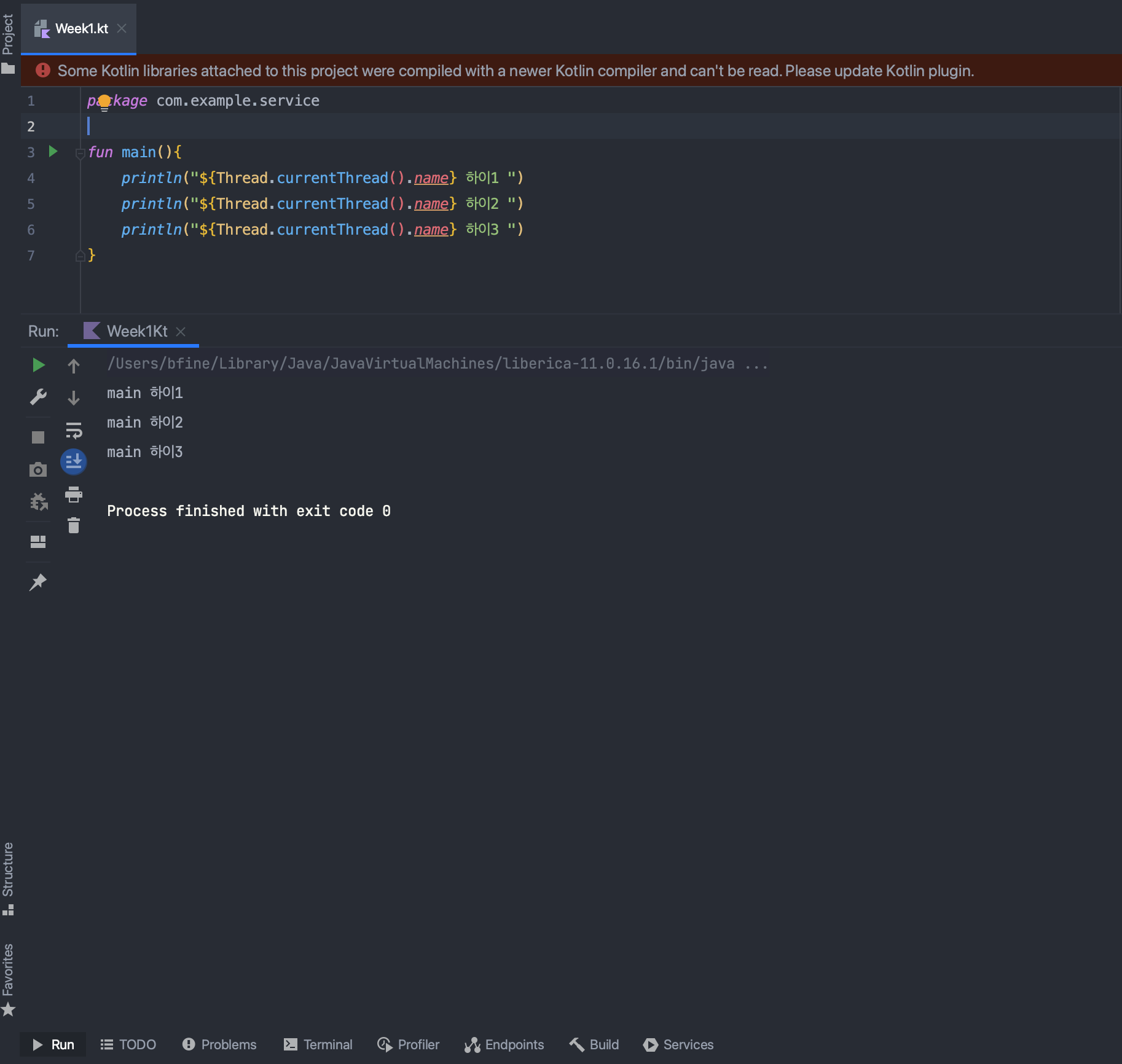 - 총 3개의 코루틴이 생겼으며 메인스레드를 점유하고 있고 launch 밖에 있는 코루틴이 먼저 실행되며 나머지 코루틴은 순차적으로 실행되었다.