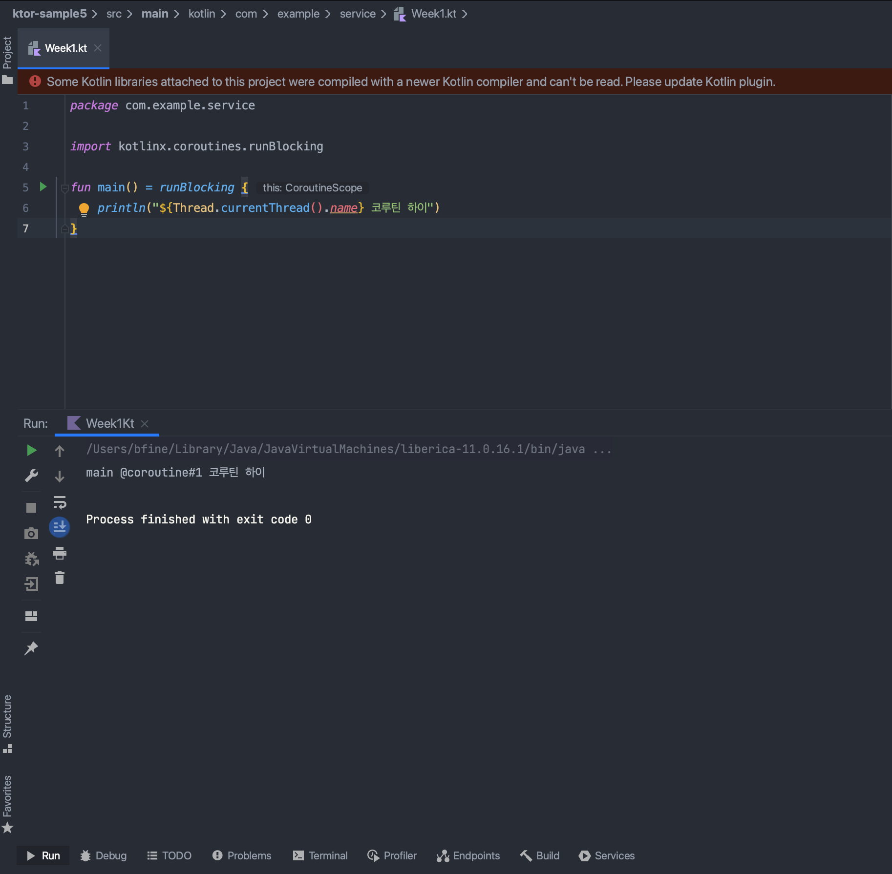 => 호출한 스레드를 점유하는 코루틴을 만들어내고 메인스레드의 점유가 종료되고 프로세스가 종료된다.