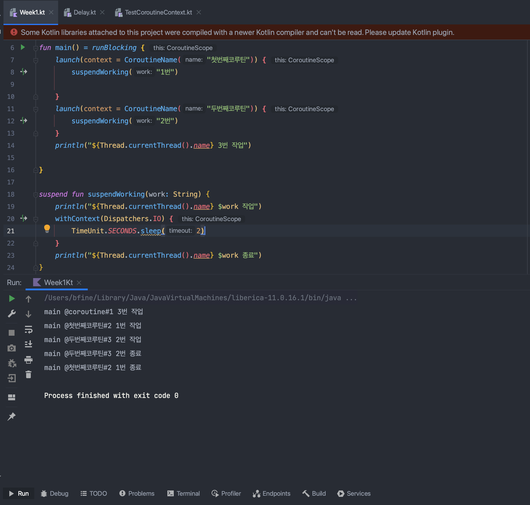 - 위와 같이 withContext를 사용해서 코루틴 디스패쳐의 스레드에서 처리하도록 설정해주어야 다른 코루틴이 실행되는것을 볼 수 있다.
