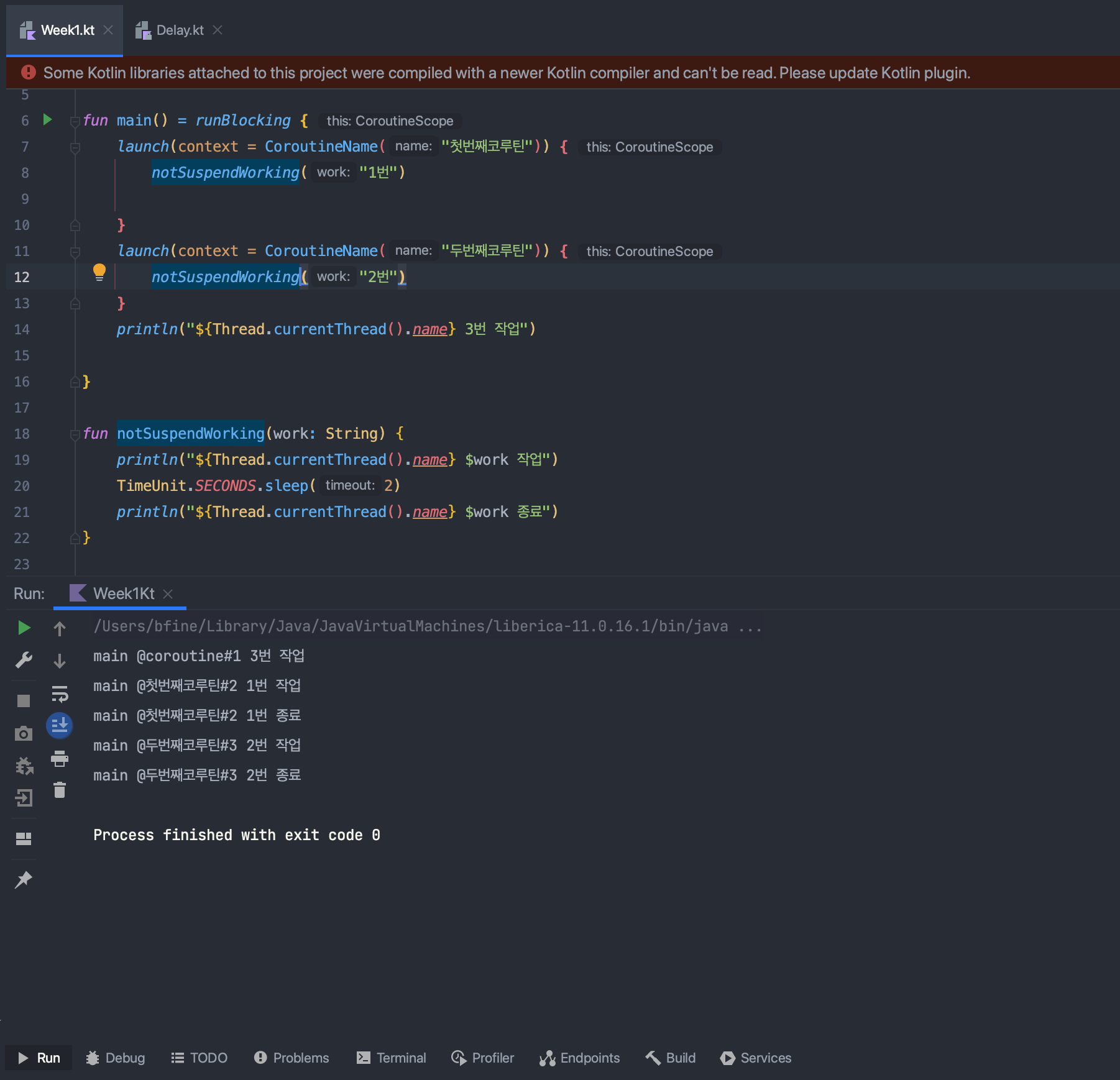 - suspend 함수가 아닌 함수를 실행하면 블로킹이 발생해도 다른 코루틴이 실행되지 않는다.