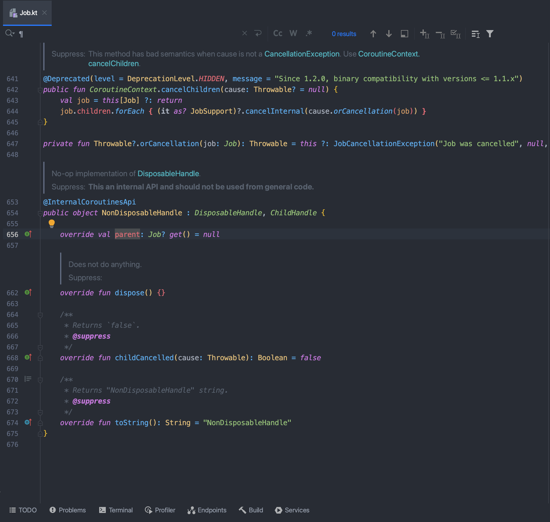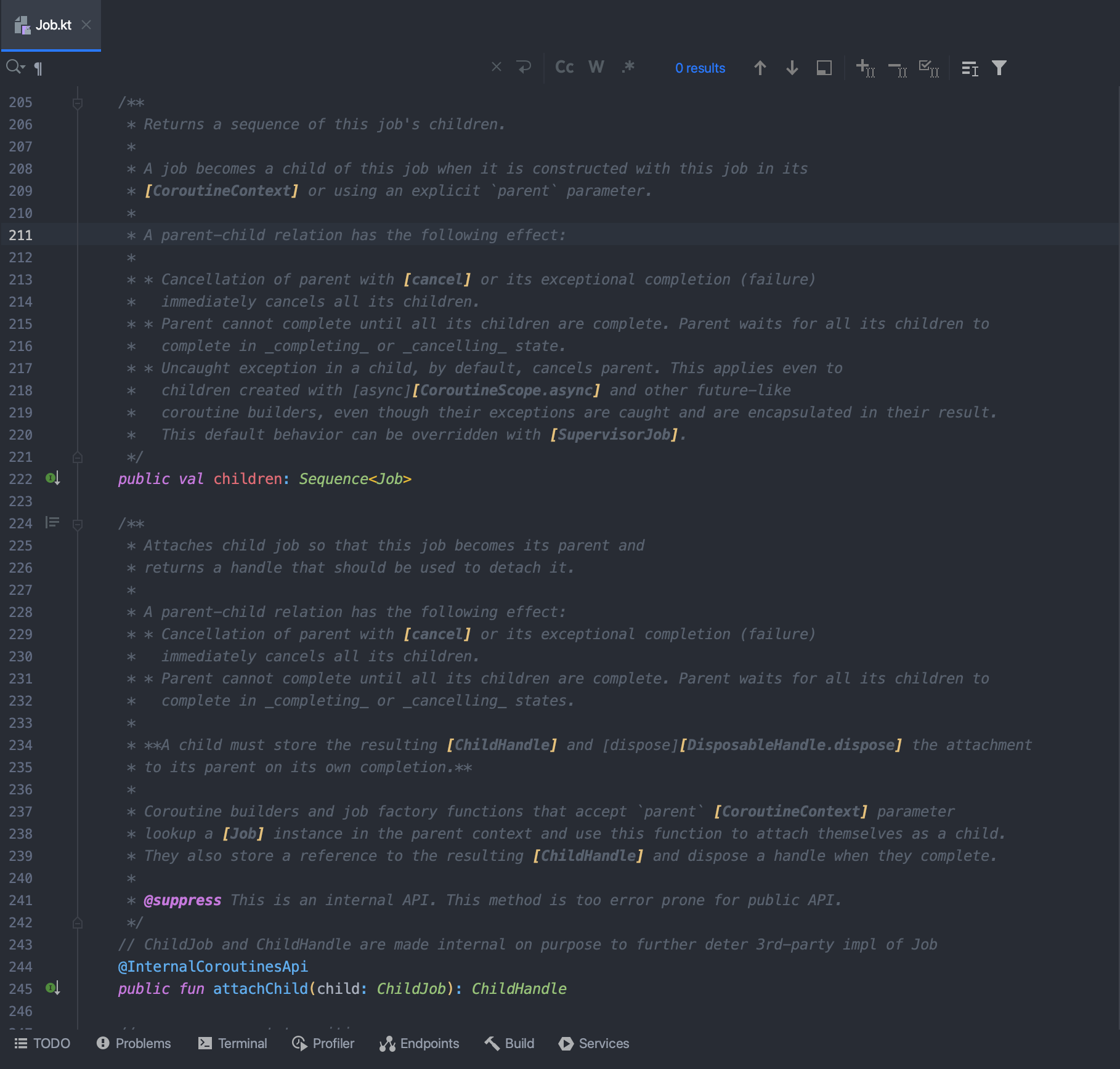 - 부모 코루틴의 Job이 취소가 되면 자식 코루틴들에게 취소가 전파되어 일반적으로 부모코루틴 하위의 모든 자식코루틴들도 작업이 취소 된다.