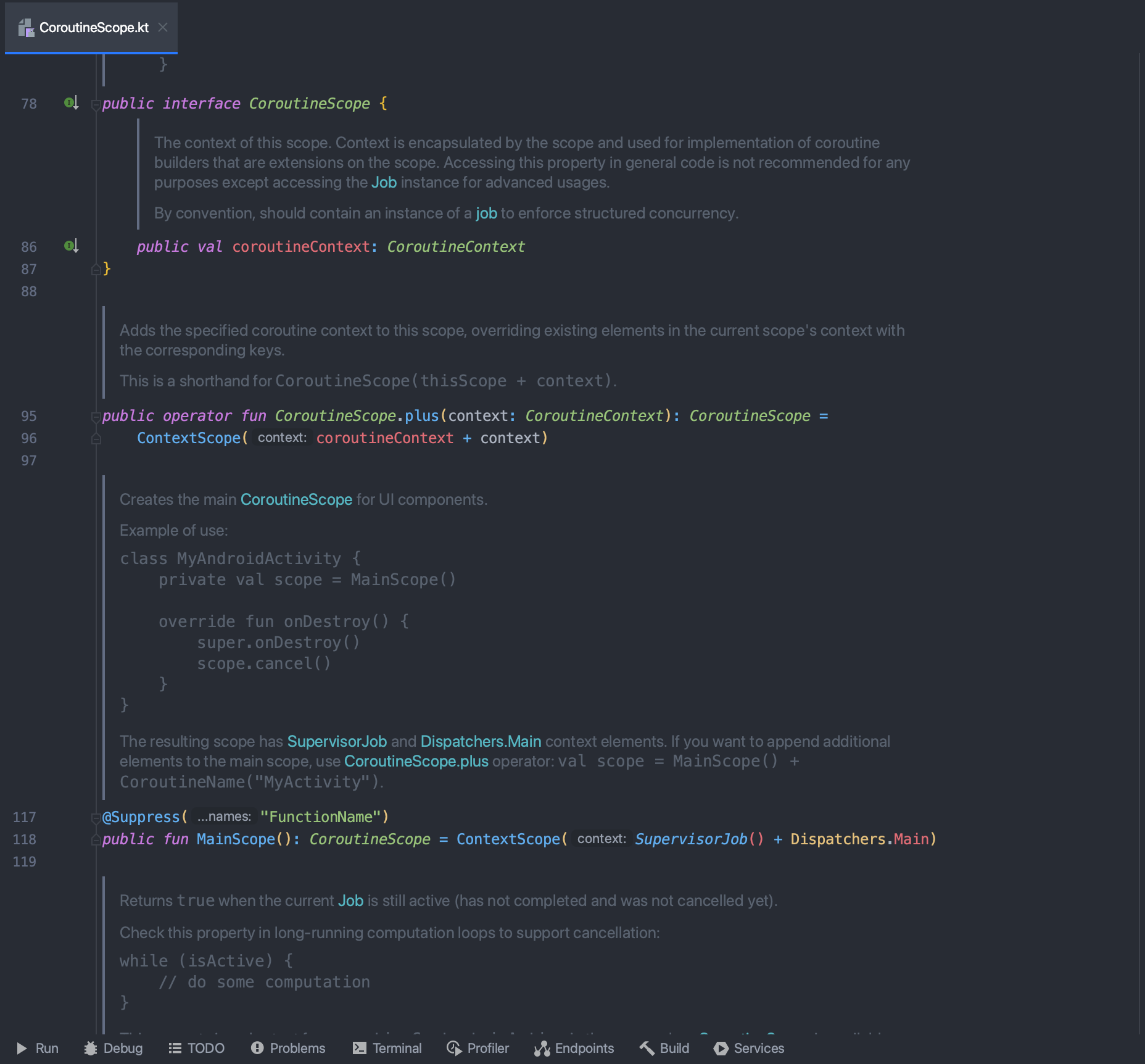 - 위의 이미지에서 보면 확장함수를 제외하고 단순 코루틴 컨텍스트만을 프로퍼티로 가진 인터페이스인 것을 볼 수 있다.