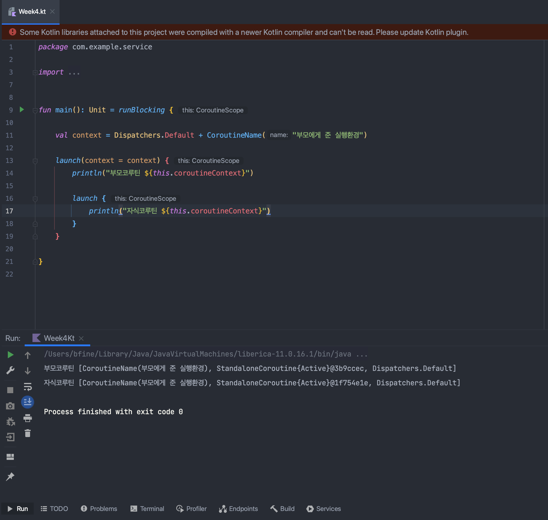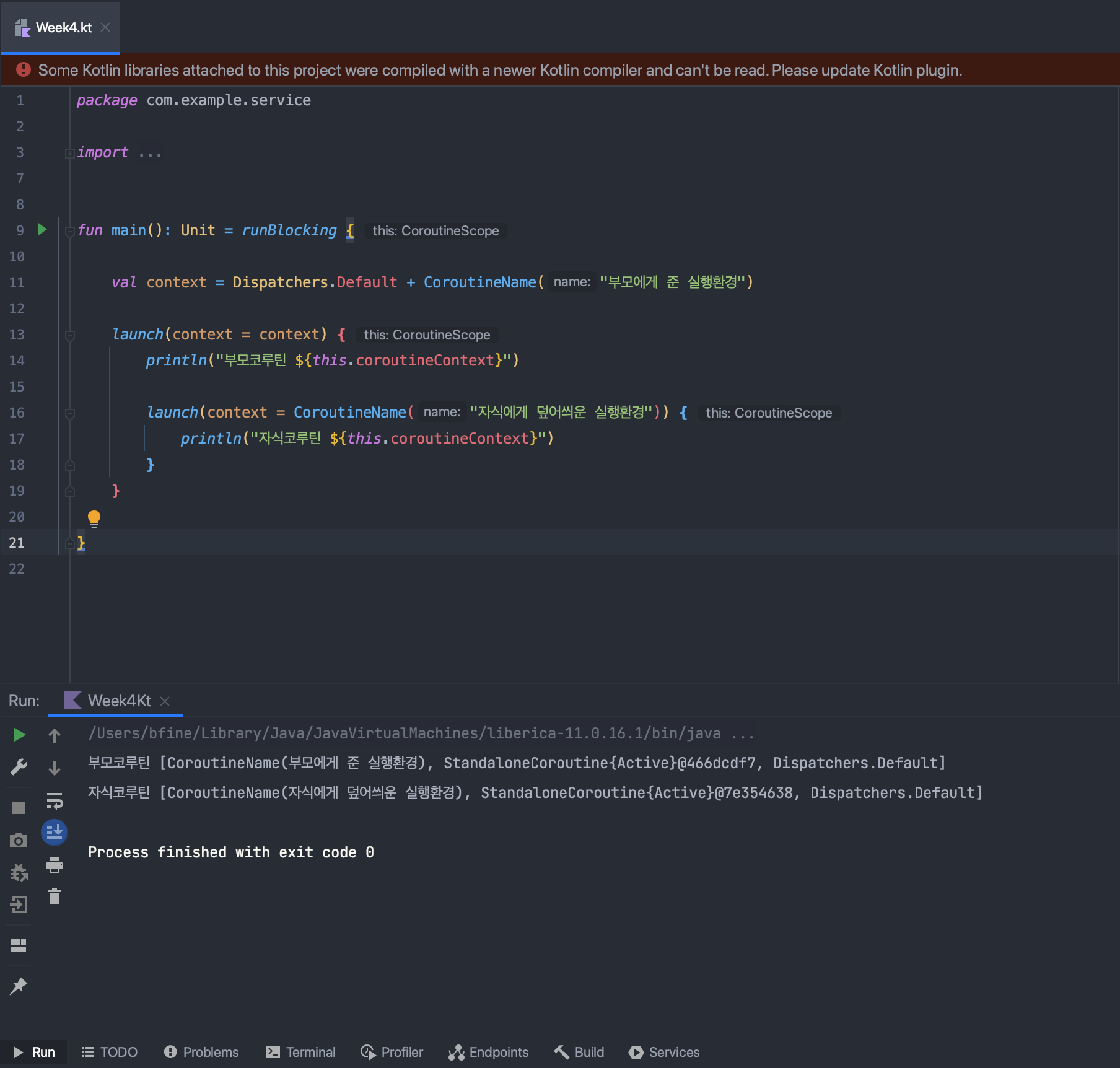 - 위의 예시의 결과처럼 코루틴은 별개로 생성되었지만 실행환경은 상속되는 것을 볼 수 있고 별도로 다르게 줄 수도 있는 것을 알 수 있다.