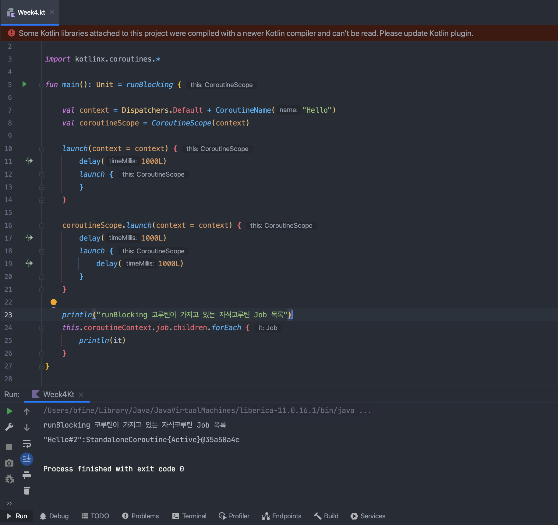 - 예시를 만들어 자세히 확인해보면 별도 CoroutineScope로 만든 코루틴은 runBlocking의 자식코루틴으로 포함되지 않는것을 확인 할 수 있었다.
