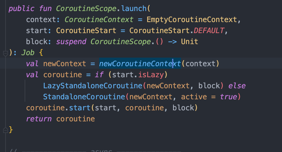 - runBlocking은 BlockingCoroutine 을 만들고 launch는 일반적으로 StandaloneCoroutine 을 만든다