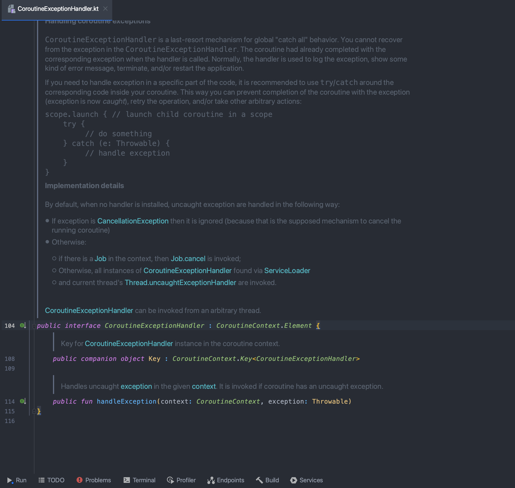 - CoroutineExceptionHandler 는 인터페이스로 context의 구성요소이므로 Key를 가지는 것을 볼 수 있고 함수로는 handelException을 가지고 있다.