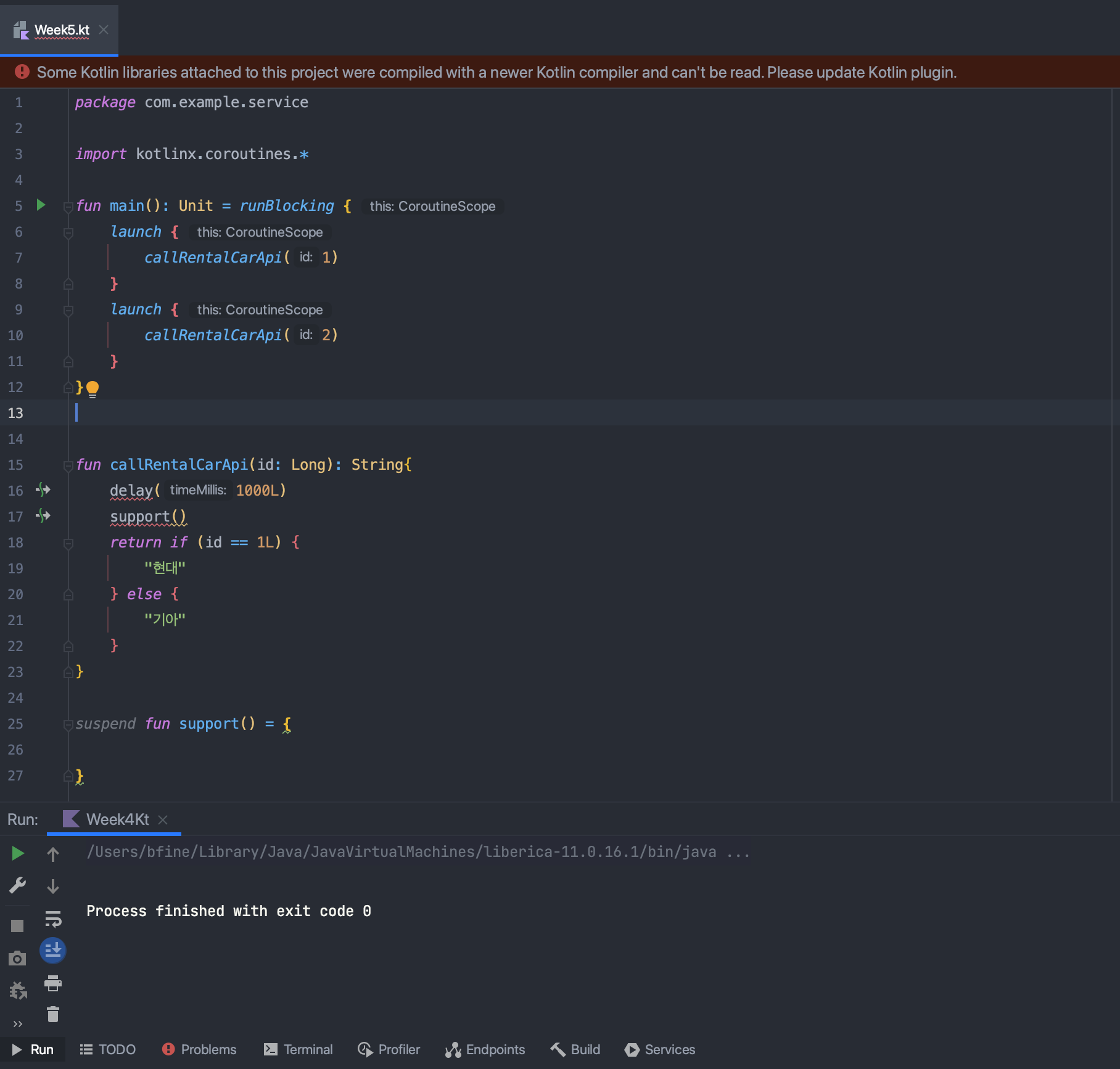 - 위에 예시를 보면 suspend 함수인 경우에는 일반 함수에서 쓸수 없는 것을 볼 수 있다.