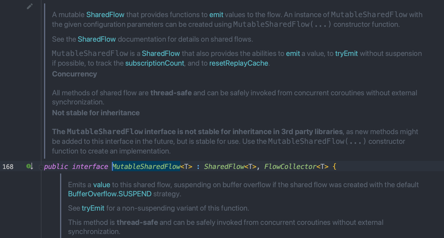 => MutableSharedFlow도 역시 살펴보면 ShardFlow 인터페이스와 FlowCollector 인터페이스를 상속하고 있는것을 볼 수 있다.